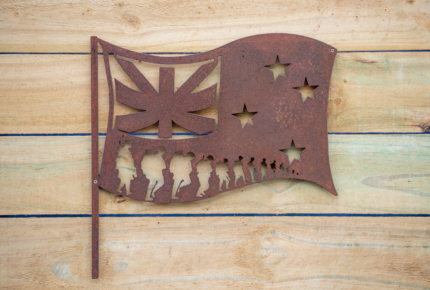 Cut from 1.6mm corten weathering steel. Rough edges are chipped away before being processed through a deburring machine giving the product its nice even finish ready for weathering.