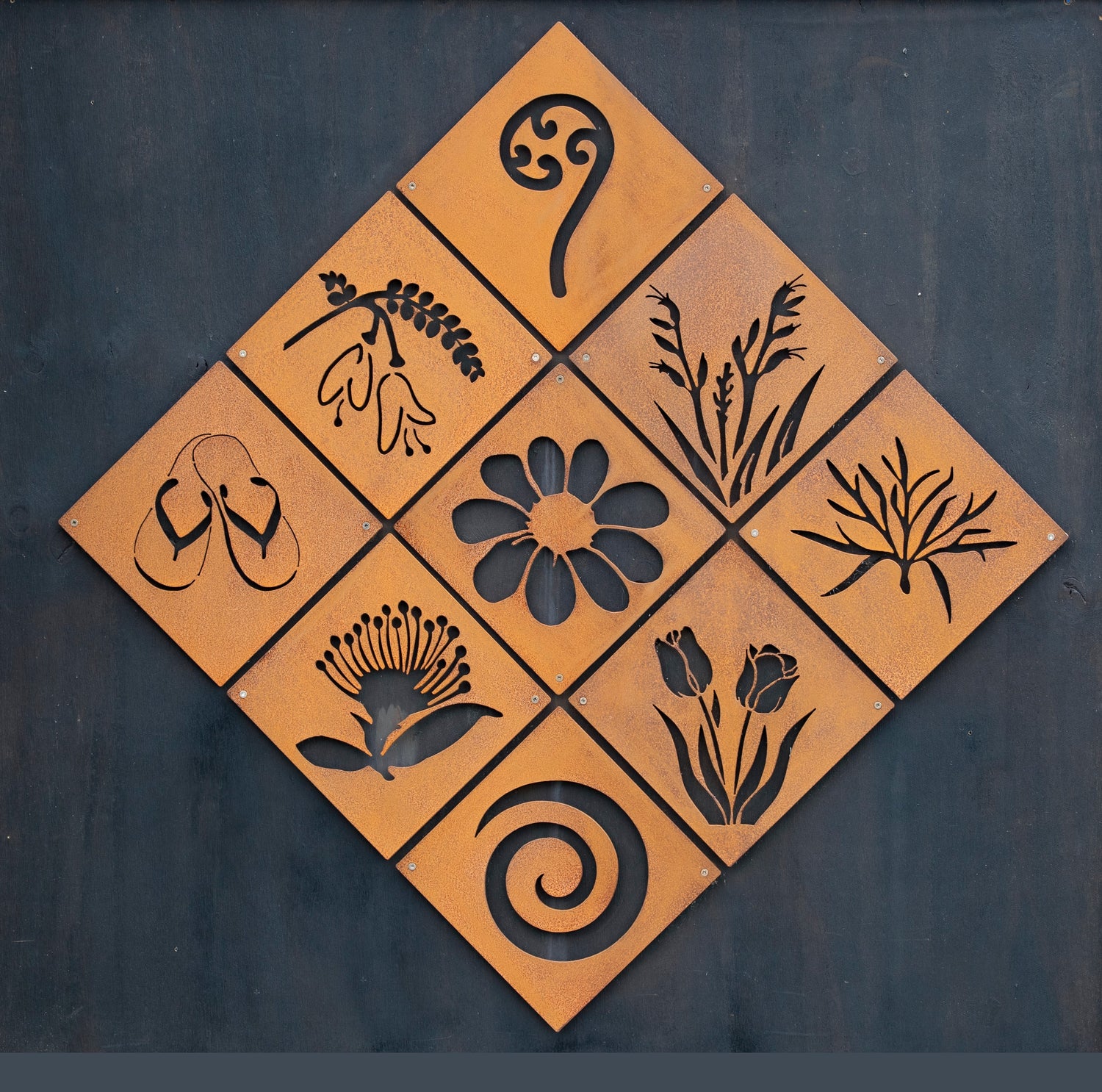 Cut from 1.6mm corten weathering steel. Rough edges are chipped away before being processed through a deburring machine giving the product its nice even finish ready for weathering.